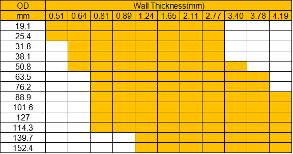 | قطر بیرونی | 19mm ~ 305mm | ضخامت دیواره | 0.51mm ~ 4.20mm |